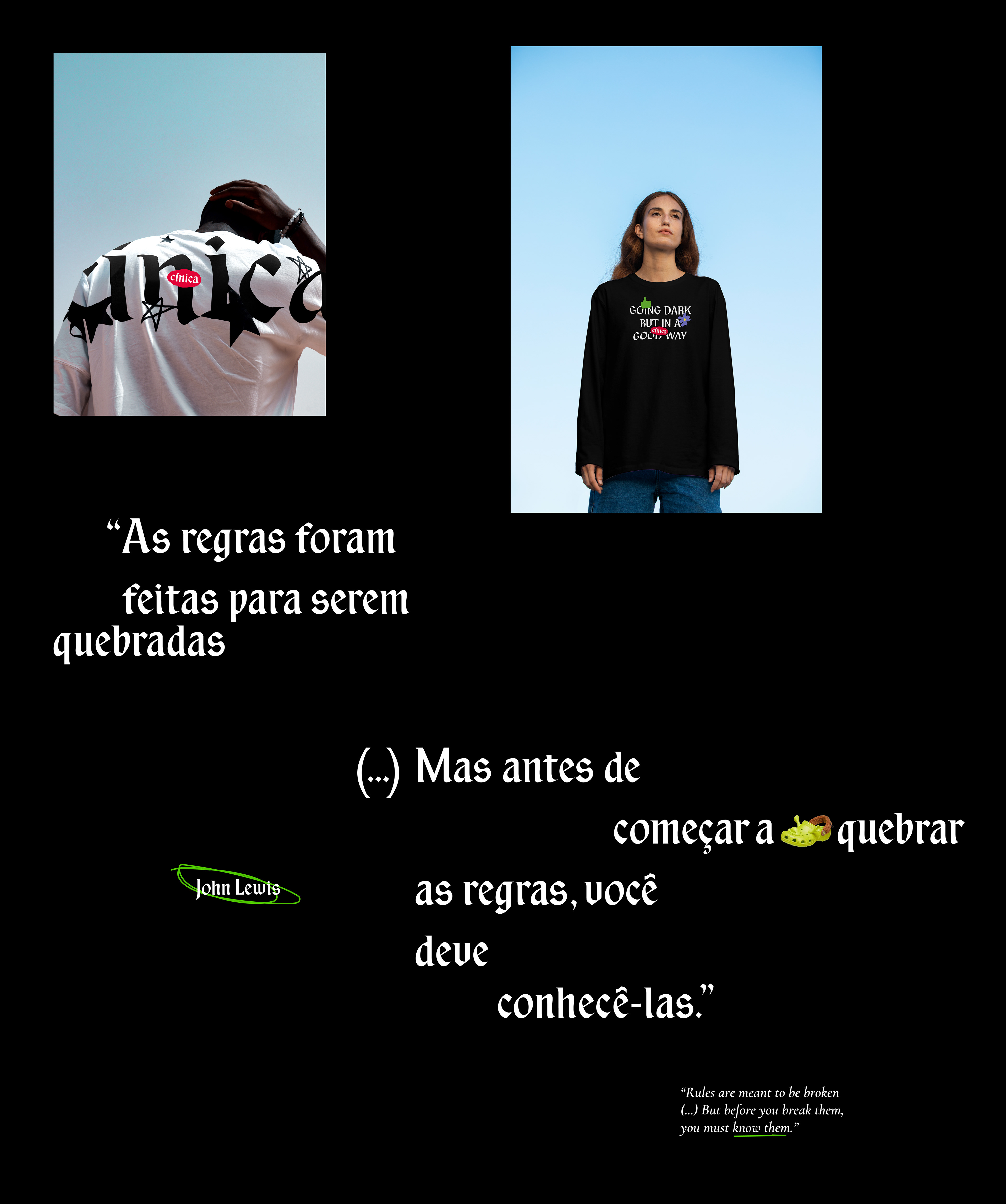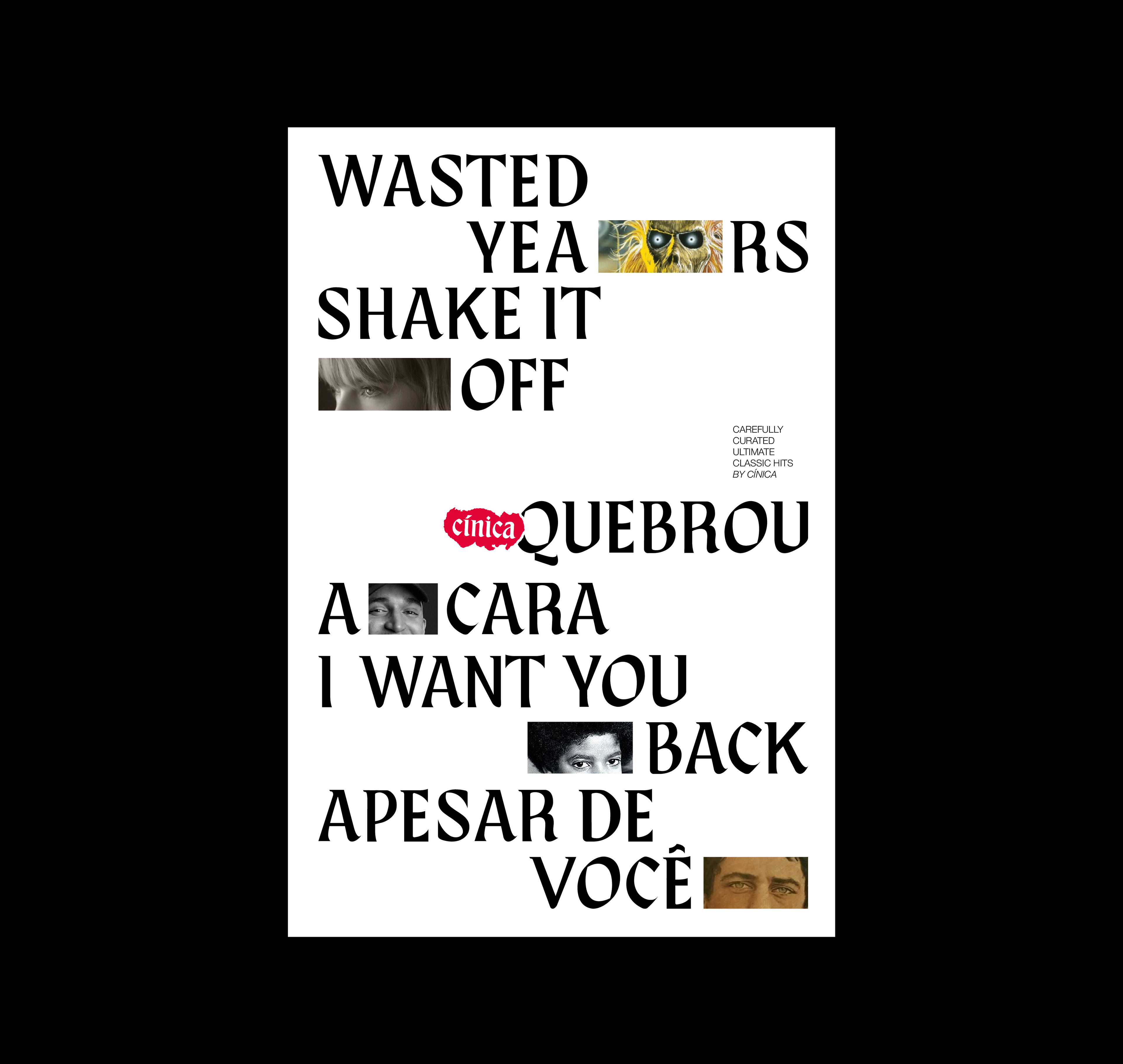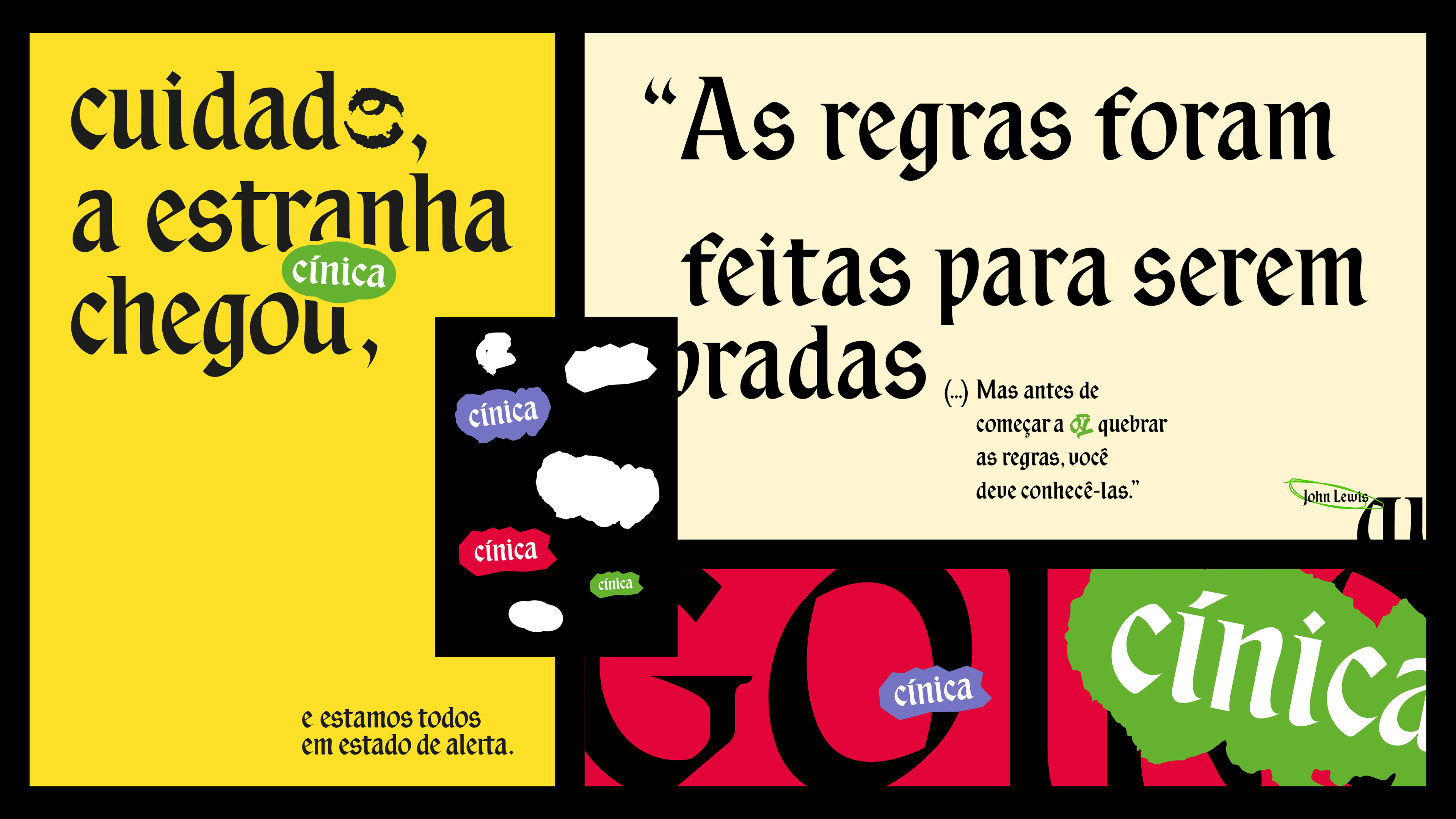 Developed as a hybrid font, it was created by combining gothic calligraphy with elements of Roman letters. Its applications function as provocative, ironic, and visually impactful pieces. To address the absence and stereotypes associated with gothic lettering in contemporary visual communication, "Cínica" is a playful attempt to generate new possibilities for the style and to promote reflection on originality and innovation in graphic and typographic design.