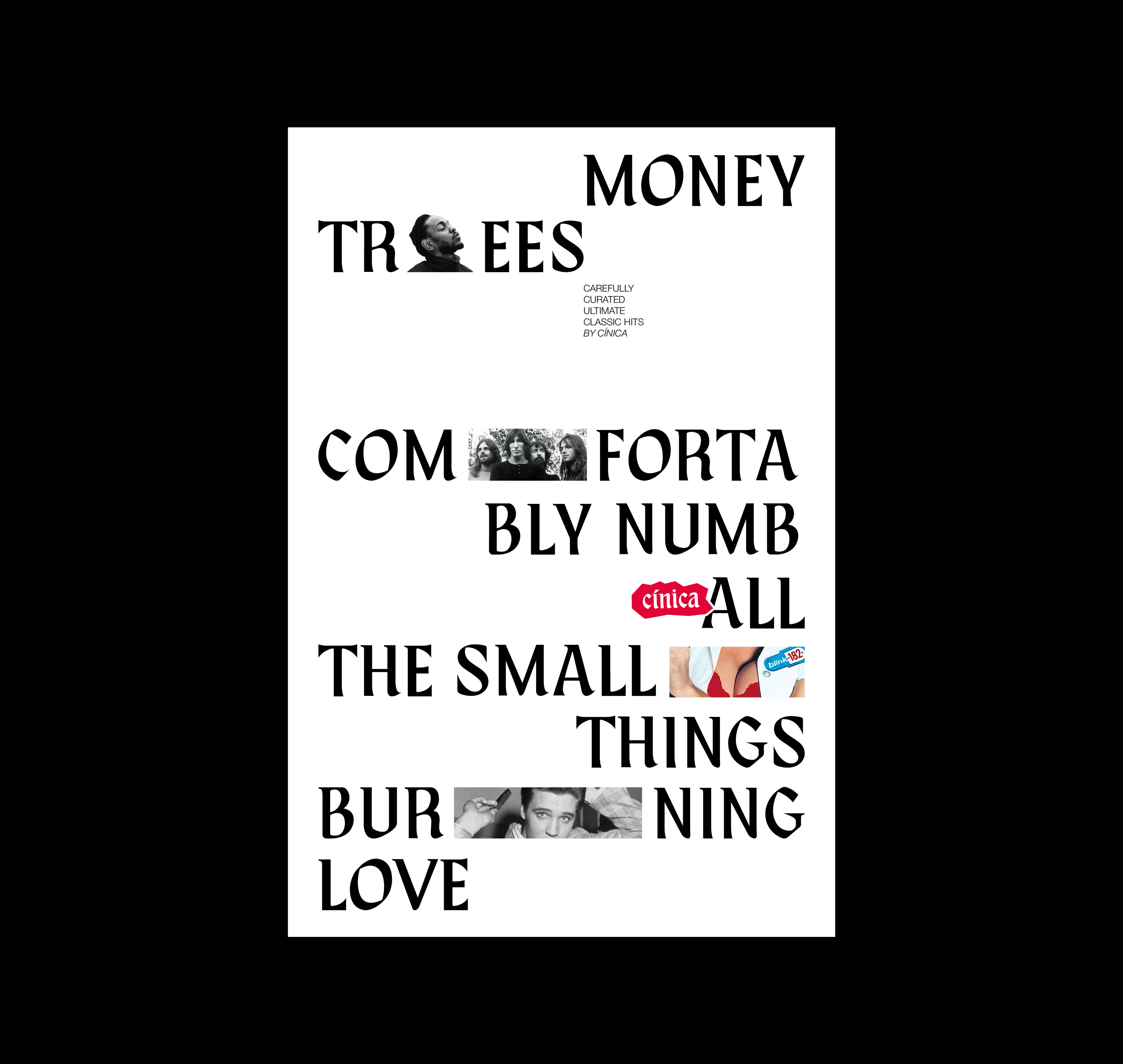 Desenvolvida como uma fonte híbrida, foi criada a partir da caligrafia gótica e adaptada com traços das letras romanas, enquanto as aplicações funcionam como peças provocativas, irônicas e de grande impacto visual. Para enfrentar a ausência e os estereótipos associados às letras góticas na comunicação visual contemporânea, Cínica é uma tentativa debochada de gerar novas possibilidades para o estilo e promover uma reflexão sobre a originalidade e a inovação no design gráfico e tipográfico.